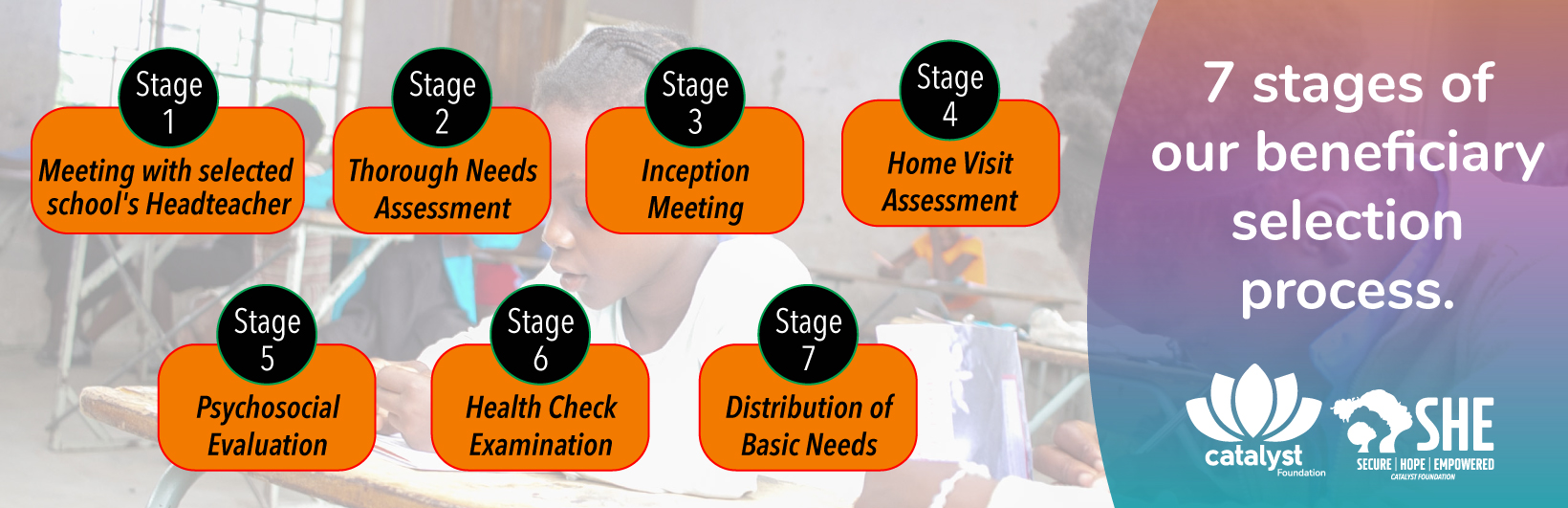 In order for us to make an informed decision about who we select to be part of our S.H.E Programme, the following 7 stages are carried out: