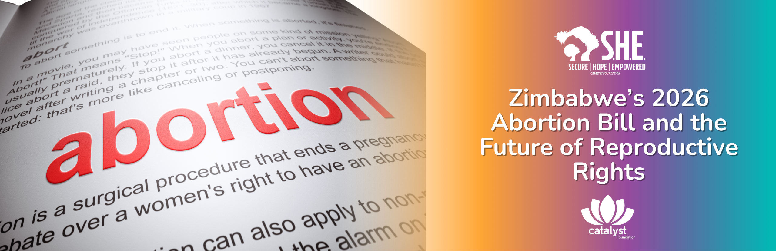 A wide banner showing a close-up, angled view of a dictionary or textbook page where the word "abortion" is printed in bold red letters. The right side of the image transitions into an orange and purple gradient featuring the "S.H.E. Secure Hope Empowered" and "Catalyst Foundation" logos. The primary text reads: "Zimbabwe’s 2026 Abortion Bill and the Future of Reproductive Rights."